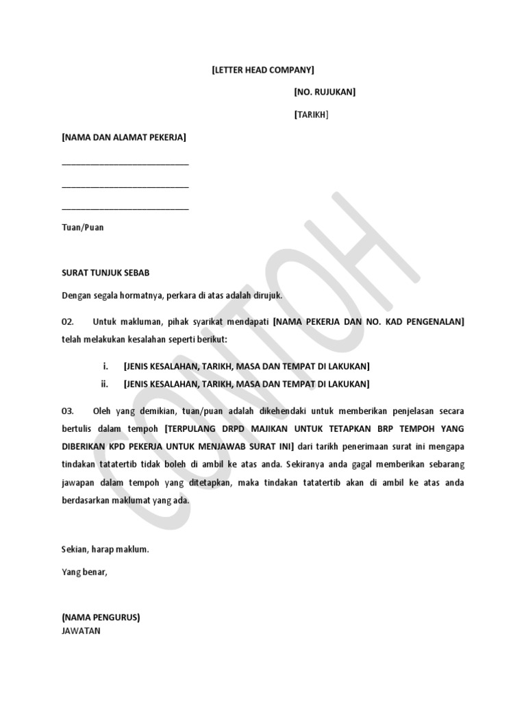 Contoh surat tunjuk sebab. Sebagai panduan untuk membuat surat penjelasan kepada majikan anda kami berbesar hati berkongsi format-format tunjuk sebab seperti di atas. Surat Tunjuk Sebab Tidak Hadir Mesyuarat.